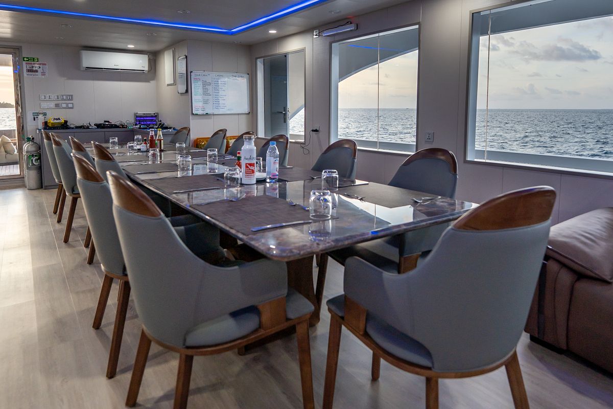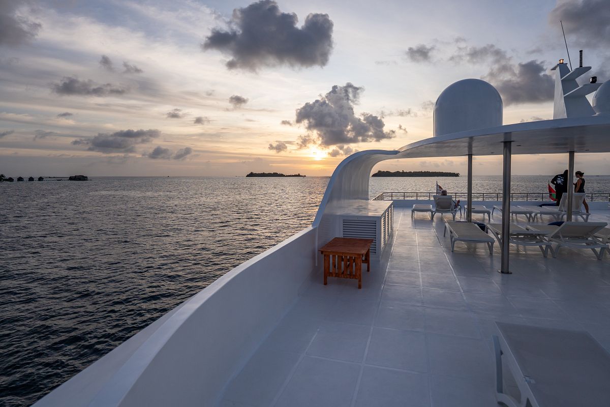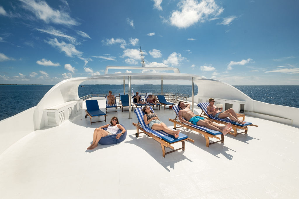Ampio sun deck attrezzato con lettini prendisole (teli mare in dotazione) e una zona ombreggiata perfetta per rilassarsi tra un’immersione/escursione e l’altra oppure ammirare la sera il cielo stellato delle Maldive.
