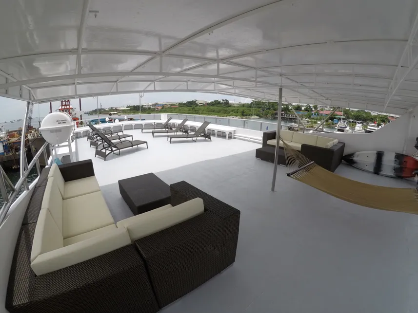 Certificato RINA naviga intorno alle principali regioni subacquee delle Filippine: Tubbataha, Visayas e Bohol, Malapascua e Leyte. Tutte le 11 cabine sono dotate di bagno privato e sono distribuite sui 3 ponti. Gli spazi per il relax sono vari. Il luogo di socializzazione più popolare è di solito il salone/zona pranzo con aria condizionata sul ponte principale. C’è anche un salotto all’aperto a poppa del ponte superiore. C’è anche un enorme prendisole, parzialmente ombreggiato, dove è possibile distendersi su sedie a sdraio o amache o godersi una cena al barbecue. I pasti regolari sono serviti nella zona pranzo del ponte principale. Qui troverete anche la biblioteca, la TV e il sistema di intrattenimento. Questa barca è dotata di molte strutture degne di nota: una sala dedicata alle telecamere, un bar che serve bevande alcoliche gratuite, tavoli per le telecamere e varie stazioni di ricarica. Il ponte d’immersione è grande e ben organizzato con postazioni individuali per i sub e casse sotto i sedili. L’attrezzatura subacquea è anche inclusa, il che è un bonus raro