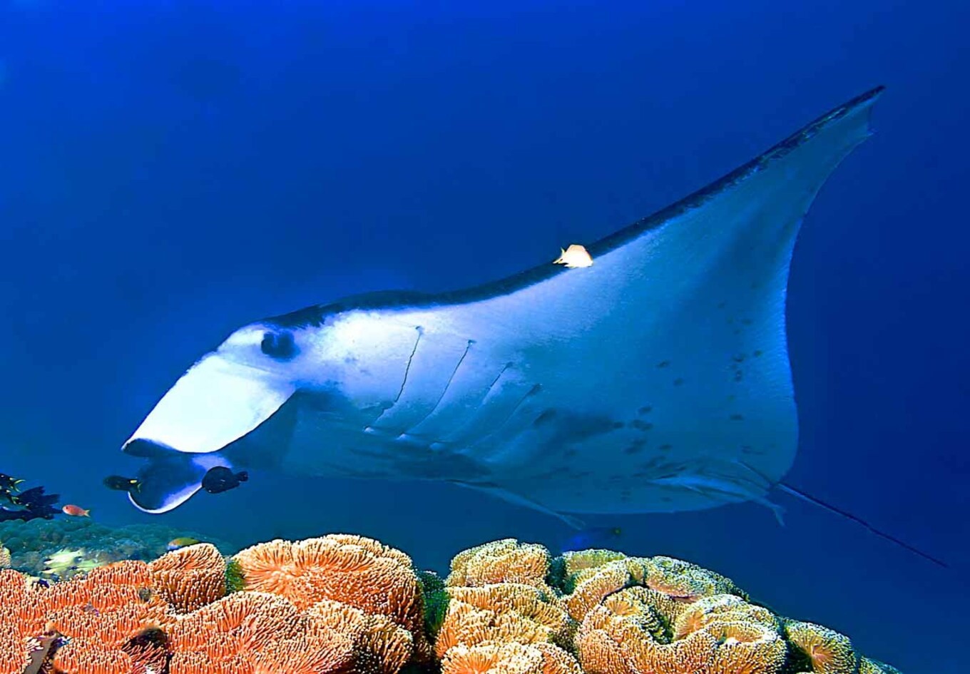 da coralli duri con alcuni panettoni colorati all’estremità orientale. Un’impressionante varietà di pesci come tonni, carangidi, barracuda e fucilieri e a volte mante oceaniche alla stazione di pulizia.