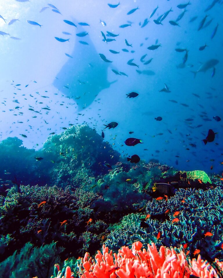 da coralli duri con alcuni panettoni colorati all’estremità orientale. Un’impressionante varietà di pesci come tonni, carangidi, barracuda e fucilieri e a volte mante oceaniche alla stazione di pulizia.